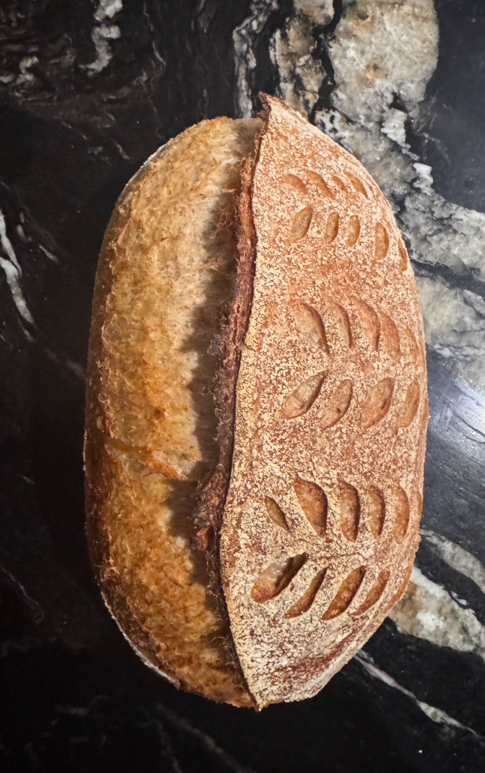 All organic 50/50 lend wheat sourdough, naturally fermented for a hearty, nutty flavor with tender, golden crumb -perfect for every day sandwich’s or toast.